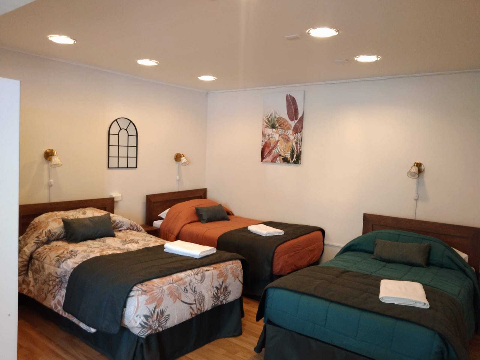 Depto 102: Cuenta con dos habitaciones (Capacidad 5 pasajeros). Su capacidad se asocia a un total de dos habitaciones; una habitación triple con 03 camas tipo single y una habitación doble con 02 camas tipo single El departamento cuenta con 02 baños, kitchenette, living comedor. Desayuno incluído