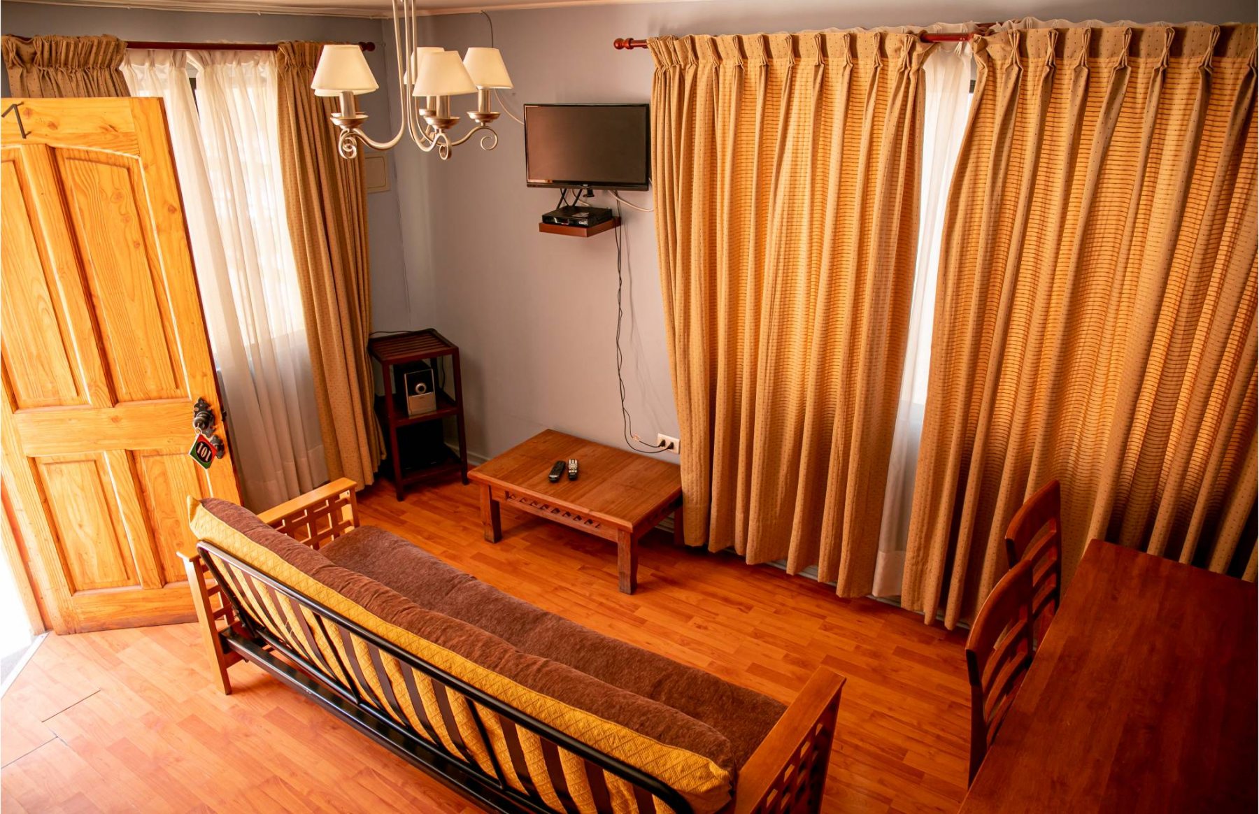 Depto 101: Cuenta con dos habitaciones (Capacidad 4 – 5 pasajeros). Su capacidad se asocia a un total de dos habitaciones; una habitación doble con 02 camas tipo single y una habitación triple con 01 cama matrimonial y 01 cama tipo single. El departamento cuenta con 02 baños, kitchenette, living comedor. Desayuno incluído